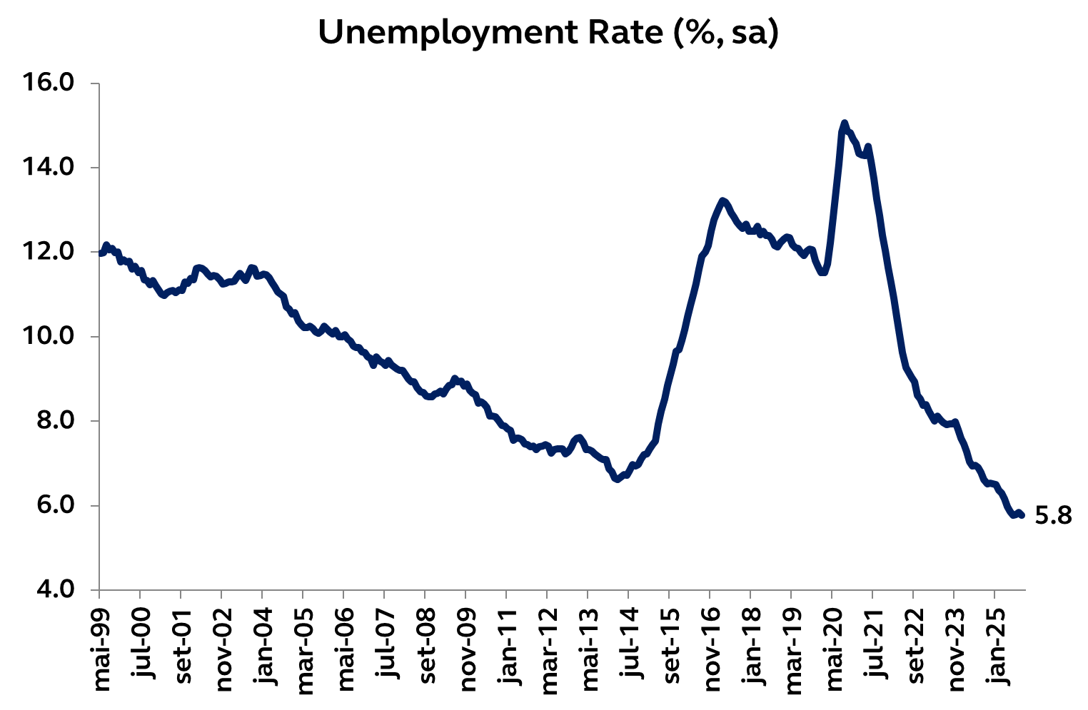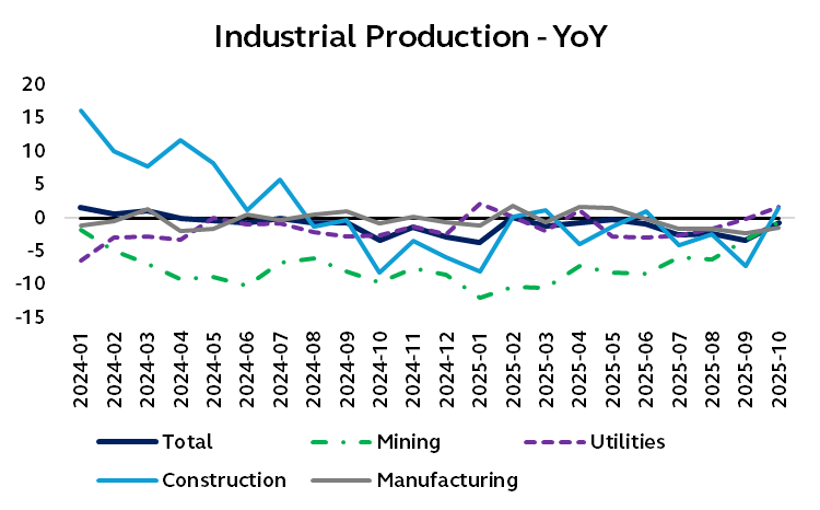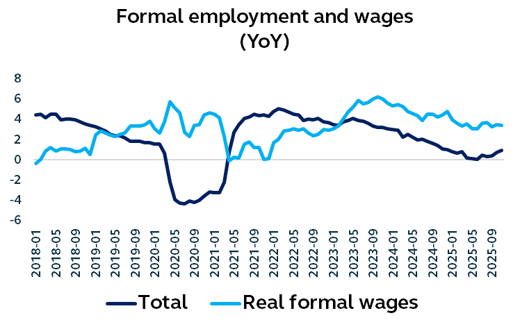 Los datos más recientes confirmaron nuestra expectativa de que la actividad económica se mantendrá débil hacia el cierre del año, aunque con señales incipientes de estabilización. La producción industrial cayó 0.4% anual en octubre, pero la contracción fue menor a la anticipada por el consenso (-2.4%), mientras que la actividad registró su primer avance mensual en cinco meses (+0.7% m/m). La recuperación secuencial estuvo impulsada principalmente por la construcción y la minería, esta última beneficiándose de una mayor producción de petróleo y gas, lo que compensó parcialmente la debilidad persistente en la manufactura, en particular en el sector automotriz, que continúa limitado por una menor demanda externa y la incertidumbre que aún persiste en torno al comercio global. La dinámica del mercado laboral sigue aportando cierto soporte a la demanda interna. La creación de empleo formal fue moderada en noviembre, con cerca de 49 mil nuevos puestos, llevando el empleo total a un nuevo máximo histórico. El crecimiento del empleo en lo que va del año se mantiene sólido en 2.7%, lo que ha ayudado a sostener el ingreso de los hogares y a mitigar la desaceleración del consumo. Sin embargo, la desconexión entre un mercado laboral resiliente y una dinámica de inversión todavía débil sugiere que la recuperación sigue siendo desigual y frágil.