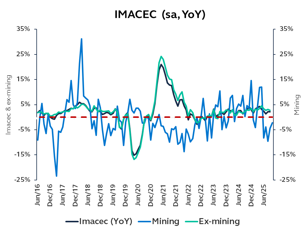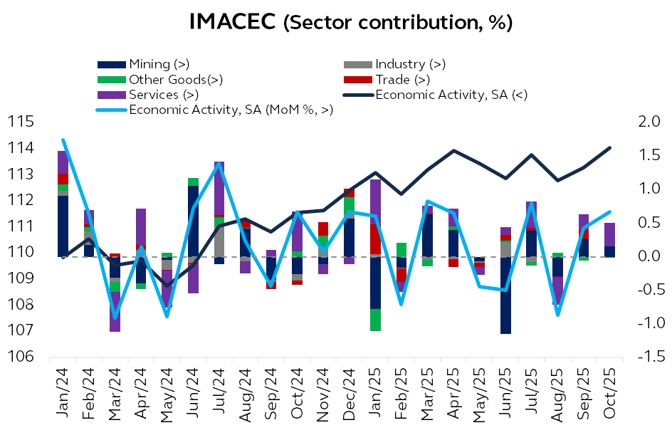 El IMACEC de octubre sorprendió ligeramente al alza, con un crecimiento anual de 2.2%, por encima del consenso del mercado de 2.0%. En términos desestacionalizados, la actividad aumentó 0.7% mensual y 2.5% anual, lo que apunta a una mejora en el dinamismo de corto plazo. El crecimiento fue generalizado entre los distintos sectores. La minería y la manufactura encabezaron los avances mensuales, ambas con incrementos de 1.4% m/m, mientras que el comercio continúa destacando en términos anuales, con una expansión de 8.1% a/a, manteniéndose como el principal motor de la actividad no minera. Tras los datos sectoriales mixtos publicados la semana pasada, que habían generado dudas sobre la dinámica del crecimiento agregado, este dato del IMACEC confirma la recuperación luego del lastre asociado a la minería observado en el tercer trimestre. En conjunto, la información refuerza nuestra visión de un crecimiento anual cercano a 2.5%, con riesgos moderados al alza, y no modifica el sesgo actual de la política monetaria. Cabe destacar que el IMACEC no minero creció 3.0% anual y 0.6% mensual (desestacionalizado), lo que subraya la resiliencia de la demanda subyacente más allá de la volatilidad del sector minero, en particular del cobre.