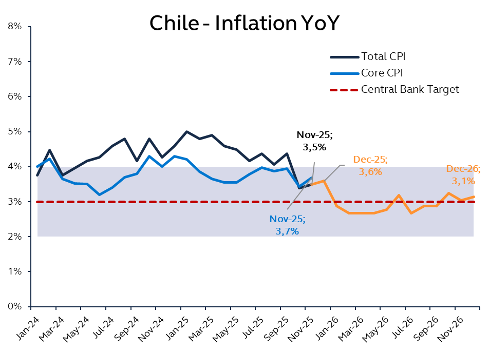 La segunda vuelta presidencial del 14 de diciembre dio como resultado una victoria contundente de José Antonio Kast, quien obtuvo 58.2% de los votos, frente a 41.8% de Jeannette Jara. El resultado estuvo en términos generales en línea con las expectativas del mercado y confirma un giro claro hacia un entorno político más orientado al mercado. En este contexto, la reacción inmediata de los mercados debería ser limitada, ya que buena parte del ajuste pro-mercado ya se había incorporado en los precios antes de la votación. No obstante, el desenlace reduce de manera significativa la incertidumbre política y refuerza las expectativas de mayor previsibilidad en la política económica, continuidad institucional y un enfoque macroeconómico más disciplinado, factores que son favorables para la confianza y la planeación de mediano plazo.