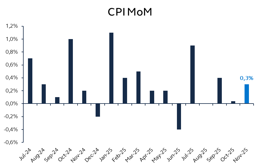 El dato de inflación de noviembre mostró un aumento mensual de 0.3% en la inflación general, en línea con las expectativas del mercado, manteniendo la inflación anual sin cambios en 3.4%. Las medidas de inflación subyacente enviaron señales mixtas: el indicador que excluye componentes volátiles aumentó 0.2% mensual y se aceleró a 3.7% anual, mientras que la medida que excluye alimentos y energía —frecuentemente considerada un mejor termómetro de la inflación subyacente— registró un alza de 0.4% mensual, pero descendió a 2.9% anual. En conjunto, el reporte de noviembre sigue apuntando a un proceso de desinflación estable, consistente con una convergencia gradual de la inflación hacia el objetivo de 3% en los próximos trimestres, en línea tanto con las expectativas del mercado como con el escenario base del banco central. Este dato refuerza aún más la expectativa de un recorte de 25 puntos base en la tasa de política monetaria en diciembre, seguido de una reducción adicional de 25 puntos base entre marzo y abril del próximo año.