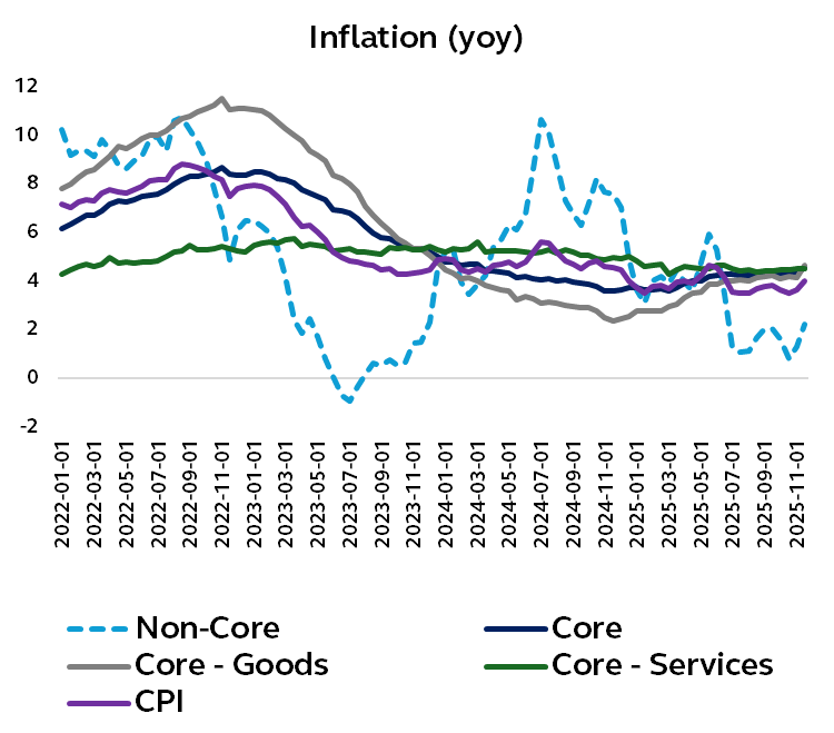 Hacia adelante, si bien los datos recientes añaden incertidumbre al panorama inflacionario de cara a 2026, es poco probable que descarrilen el proceso de relajamiento monetario en el corto plazo. La debilidad de la actividad económica, un peso fuerte y una inflación general que se mantiene por debajo de 4% deberían permitir a Banxico realizar un nuevo recorte de tasas en la próxima reunión. No obstante, el panorama más allá de ese movimiento se vuelve menos claro. En caso de que las presiones en la inflación subyacente persistan o se intensifiquen, el margen para recortes adicionales se reduciría, lo que probablemente llevaría a una postura más cautelosa. Hacia adelante, la evolución de la inflación de servicios y la normalización gradual de los componentes no subyacentes serán claves para evaluar la sostenibilidad del ciclo de relajamiento y sus implicaciones para los mercados locales.