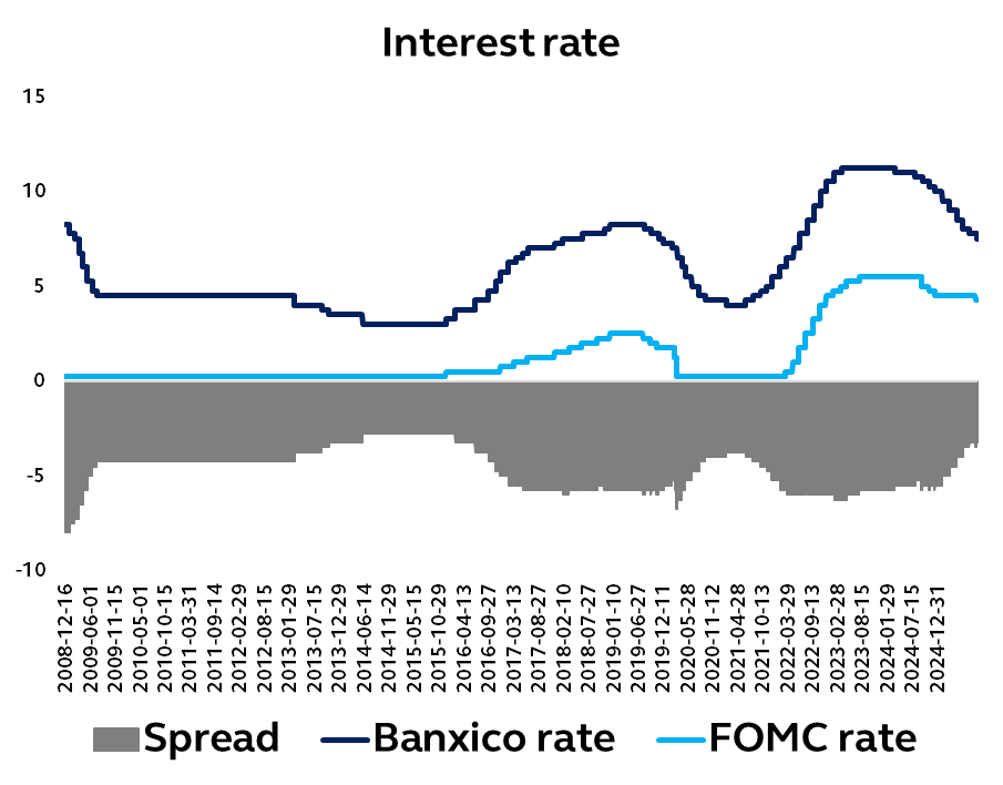 En el frente externo y político, la política comercial y la dinámica del T-MEC están ganando relevancia. En diciembre, México aprobó nuevos aranceles a las importaciones provenientes de países con los que no tiene un tratado de libre comercio, con el objetivo de proteger a las industrias nacionales y corregir distorsiones comerciales, con un impacto inflacionario esperado positivo pero limitado. Al mismo tiempo, las discusiones en torno a la revisión del T-MEC se están intensificando, con México reiterando su compromiso con un marco trilateral, pese a episodios ocasionales de retórica bilateral por parte de Estados Unidos. Nuestro escenario base sigue siendo que se alcanzará un acuerdo que preserve los elementos centrales del T-MEC hacia finales de 2026, aunque en un entorno de elevada incertidumbre y con potencial volatilidad a lo largo del proceso de negociación.