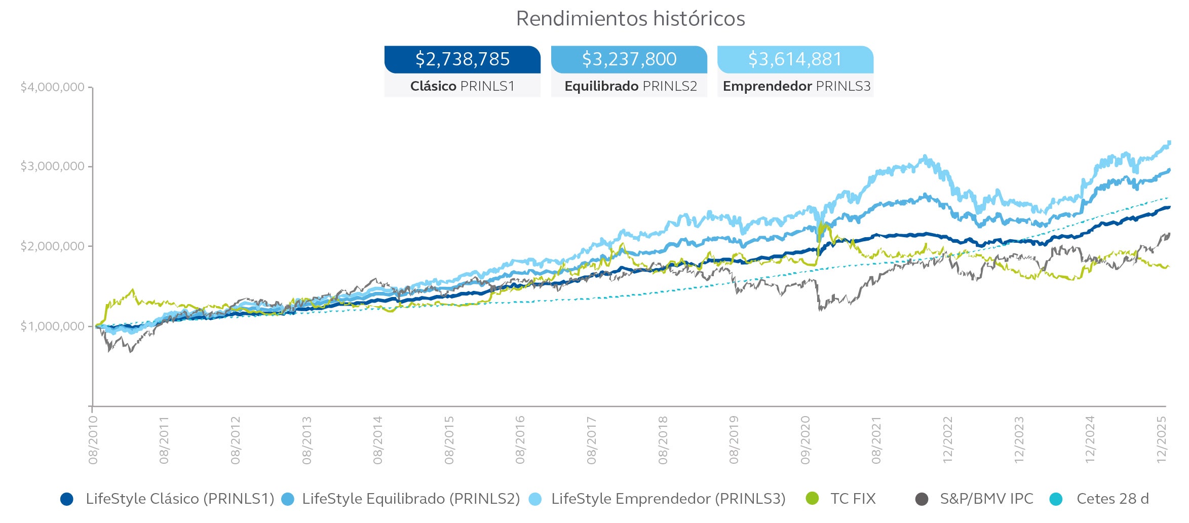 - Rendimientos efectivos netos acumulados PRINLS3 del 04/08/2008 al 31/12/2025 Clase FA, asumiendo que se mantenga la inversión inicial de $1,000,000 M.N.